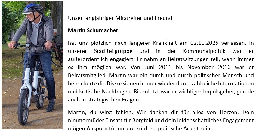 Demokratische, allen Bürgerinnen und Bürgern gerecht werdende Politik ist im Beirat Borgfeld seit Langem nur in sehr engem Rahmen möglich, nämlich dann, wenn sich die CDU selbst Vorteile davon verspricht. Die „Brandmauer“ ist in Borgfeld längst gefallen, CDU und BD stimmen stets gemeinsam und nutzen ihre Mehrheit aus. Populistische Statements seitens der CDU führen regelmäßig zu Kopfschütteln, und wenn vor der Wahl mal ein Thema ungelegen kommt, fehlen zufällig sämtliche Mitglieder dieser beiden Fraktionen, so dass die Beschlussfähigkeit nicht gegeben ist.