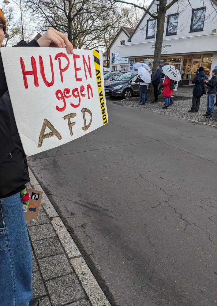 Es war ein großer, bunter, kreativer und fröhlicher Haufen, der am 17.01.2026 bei strahlend-kühlem Wetter in Borgfeld zusammengekommen war. Parteien, Initiativen und Privatpersonen demonstrierten gegen die Partei, die mit menschenfeindlicher Politik unsere Verfassung zu untergraben versucht. Es gab Stände, Plakate, Straßenbemalung, Musik und Sprechchöre, und ein imposantes Polizeiaufgebot beschützte die Szenerie. Die Wümmezeitung berichtete, und die nachfolgenden Bilder sprechen für sich. Wer sich für weitere Aktionen dieser Art mit Material versorgen möchte, kann sich auf dieser Website umsehen.