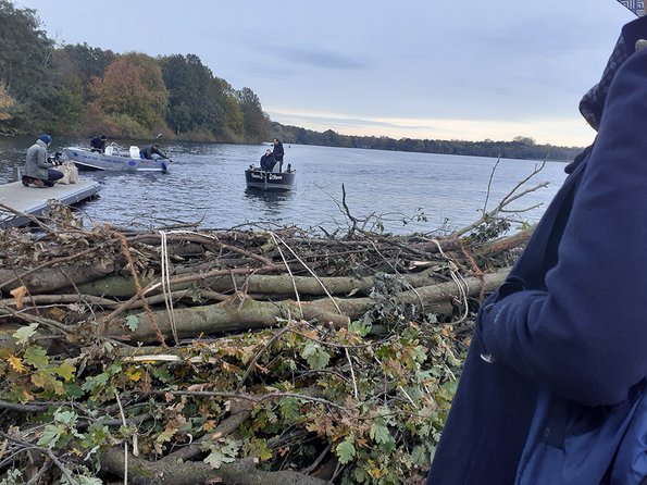 Viele gebündelte mittelgroße Baumstämme wurden mit sandgefüllten Jutesäcken beschwert. Mit kleinen Booten zogen sie an ihren Bestimmungsort: Das Totholz wurde am Ufersaum nahe der Surfschule versenkt.