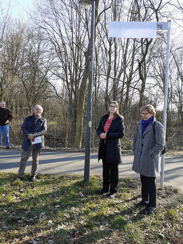Am 2. März trafen sich Großnichte Margrit Thimme und unser Stadtteilchronist Michael Koppel, Ortsamtsleiterin Inga Köstner mit Vertreterin, zuständige Mitarbeiter*innen des Amtes für Straßen und Verkehr, 1 SPD-Vertretung aus dem Beirat sowie eine sehr große Delegation mit 6 Vertreter*innen der Horner Grünenfraktion. Die feierliche Enthüllung eines Namensschildes Schildes des Fuß- und Fahrradweges zwischen der Riensberger Straße und der H.H.-Meier-Allee wurde nun vorgenommen. Wir Grünen haben durch Initiative unseres Beiratsmitglieds Michael Koppel die Umbenennung auf den Weg gebracht und schließlich einen Beiratsbeschluss herbeigeführt. Wir freuen uns, dass unser Vorhaben nun endlich Erfolg hatte. Mit ihrer Großnichte Margrit Thimme konnte eine direkte Nachfahrin Magdalene Thimmes eingeladen werden, die extra aus dem Rheinland angereist kam.