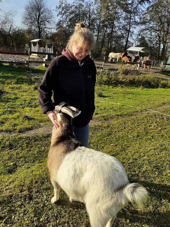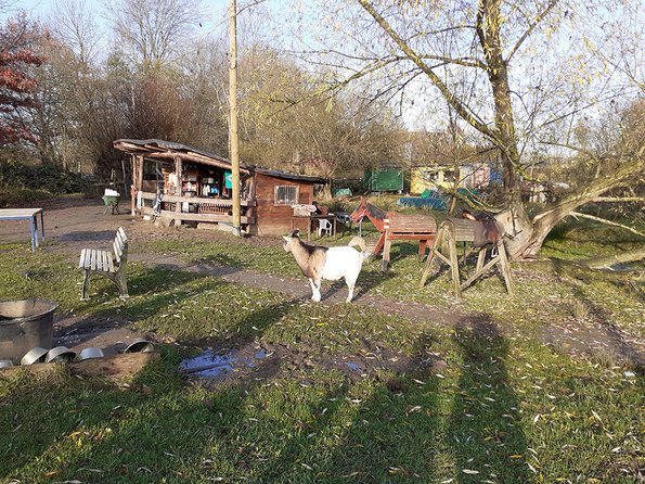 Anke Liebezeit erwartete uns. Sie ist Erzieherin mit vielfältigen Zusatzausbildungen und langjährige Vorsitzende dieses Vereins. Mit viel Begeisterung berichtete sie uns von ihrer ökologisch geprägten erlebnispädagogischen Arbeit „Kinder brauchen die Natur“. Bei unserem Rundgang durch das 4ha große Areal stapften wir am meterhohen Buddelsandhaufen vorbei durch nasse, saftige Wiesen entlang an natürlichen Brombeerheckenbegrenzungen. Wir begegneten den inzwischen zahmen alten Ziegen, den Hühnern mit stolzem Hahn, den Katzen aus dem Tierheim, den Pferden und Ponys.
