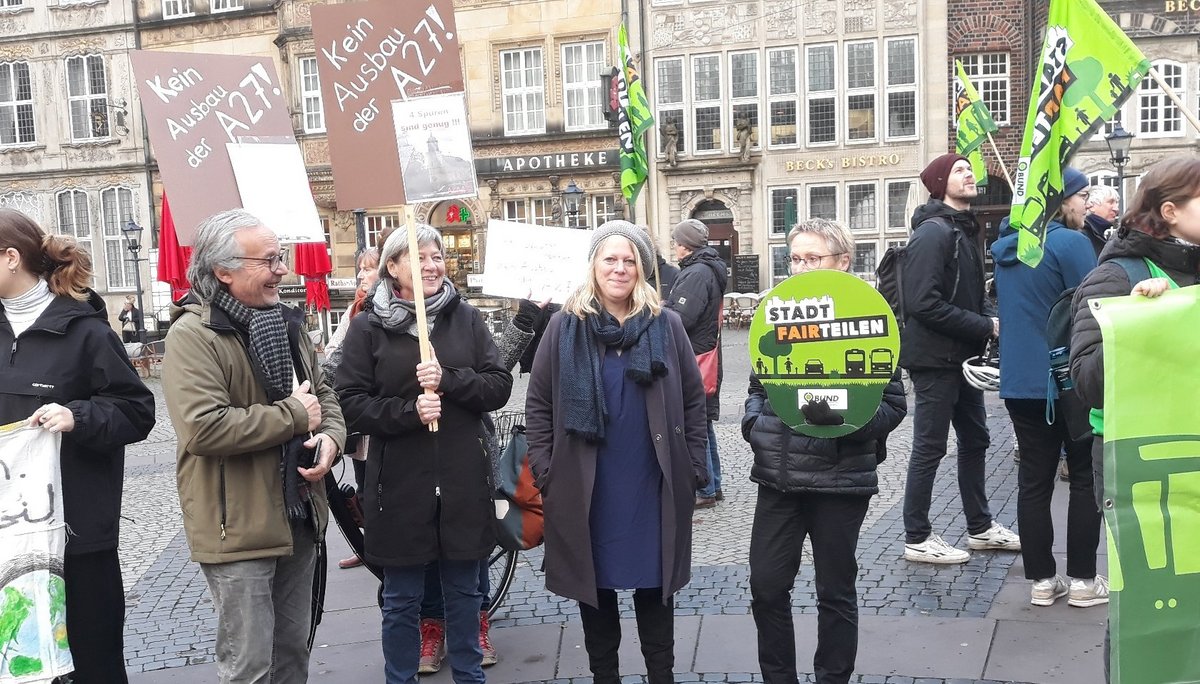 Am 15. November 2023 fand vor der Bürgerschaft eine Kundgebung gegen den 6-spurigen Ausbau der A27 statt. Auch wir Grüne waren natürlich dabei! (Foto: Michael Koppel)